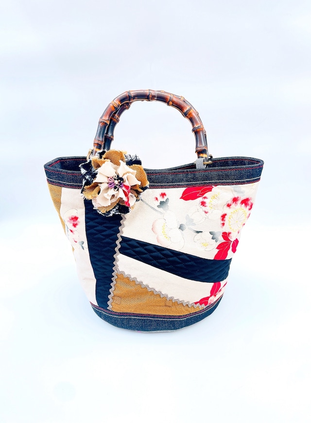 アンティーク着物×デニムのバック。 見ているだけで、ワクワク楽しくなるようなバックを作っています。 1点づつバックのステッチや刺繍、ビーズ刺繍のカラーを変えて、ときめいて製作。 コサージュは、中心につまみ細工のお花をあしらい、立体感を出しています。取り外し可能です。 コサージュだけがほしい!! と思われたら、CONTACTくださいませ。 お時間いただきますが、同じ雰囲気のコサージュを作らせていただきます♫ ※全て1点物の為、全く同じ物は作れませんので、ご了承くださいませ。 サイズ : 縦25cm 幅36cm 直径22cm 素材 : 絹・デニム・ベロア・スパンコール・ビーズ 持ち手 : 竹(ジョイントを含め長さ36cm) ※アンティーク着物で製作してますので多少のシミや汚れ、穴なども、布の魅力として考えております。ご了解の上、ご購入くださりますようお願い致します。 様々な生地(絹、綿、化繊、革)などを使用してますので、色落ち色落ちする場合がありますので、水にご注意ください。 また、頻繁に出し入れや毎日の使用する場合、耐久性の点では、過度があります。 日のあたる場所での保管は、色あせの原因になりますのでお避けくださいませ。