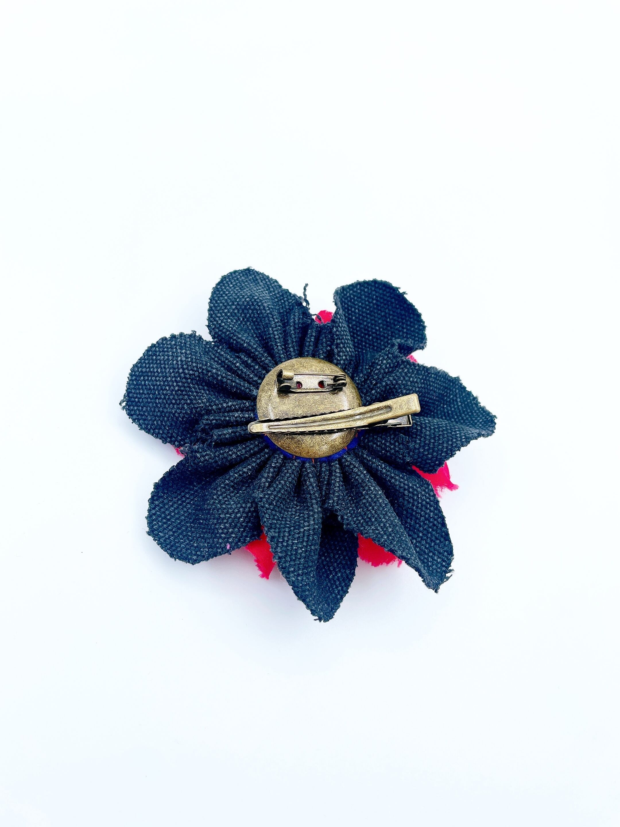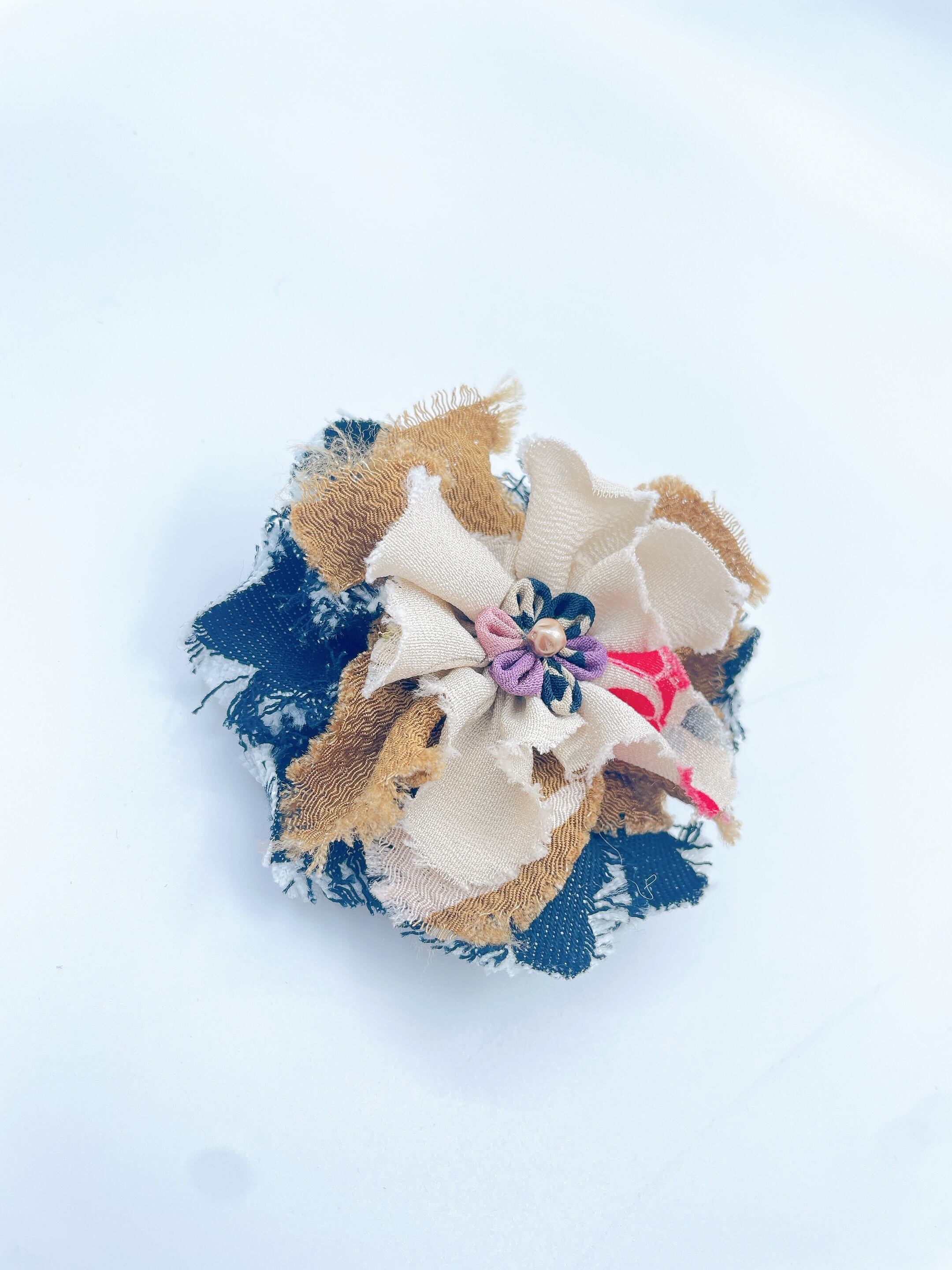 コサージュは、中心につまみ細工のお花をあしらい、立体感を出しています。取り外し可能です。